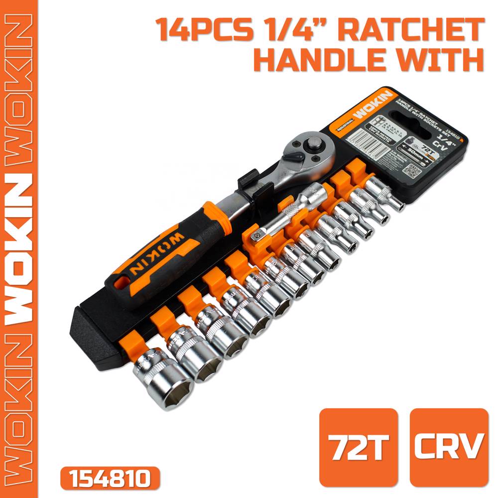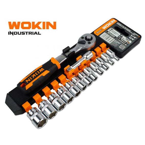 ქანჩის გასაღები სათადარიგო პირებით Wokin 154810, 1/4″, 14Pcs, Drive Ratchet Handle With Sockets Set (INDUSTRIAL), Silver