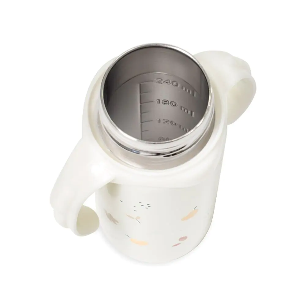 დამატებითი ინფორმაცია: 240 მლ-იანი თერმული ბოთლი საწოვარა თავით უნარჩუნებს სასმელს სითბოს ორმაგი ლითონის კედლის დახმარებით. ბოთლს აქვს კომფორტული ყურები ხელის მოსაკიდებლად, რომელიც იხსნება. ბოთლი შიგნიდან აღჭურვილია პრაქტიკული საზომით. გამოიყენება ბავშვებისთვის 0-იდან 2 წლამდე. არ შეიცავს ბისფენოლს - 100& BPA FREE