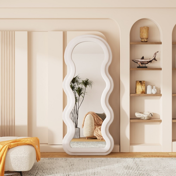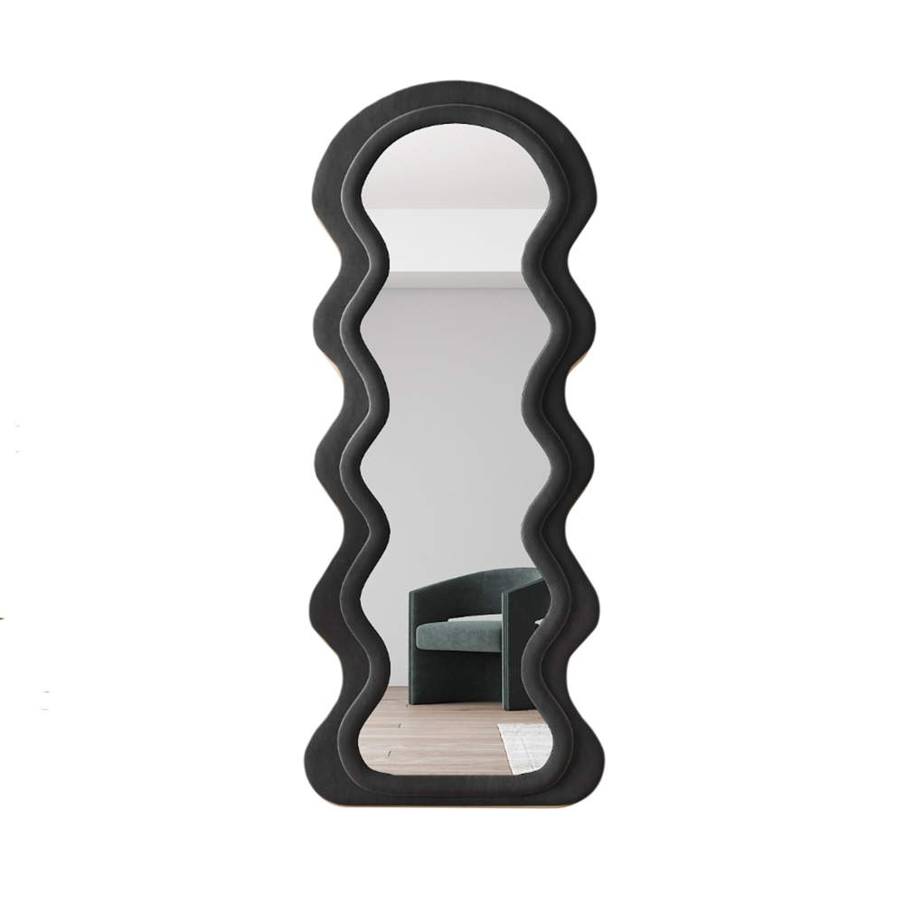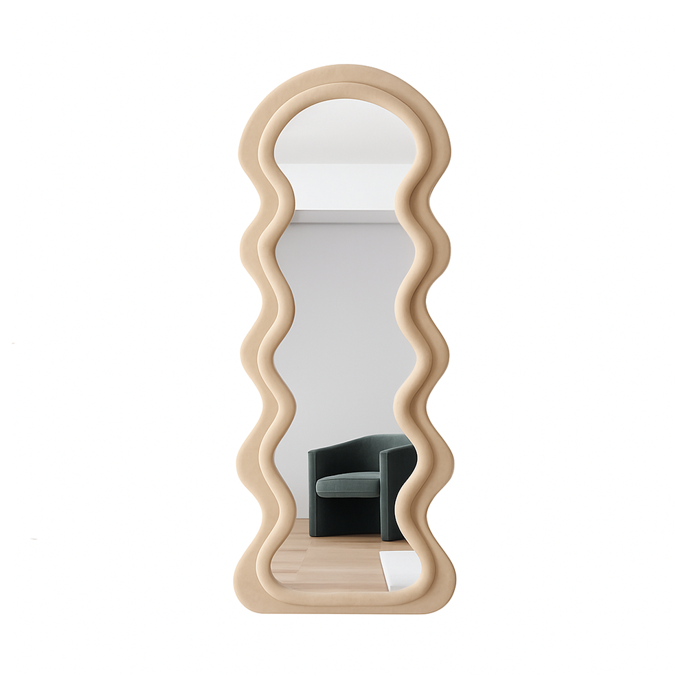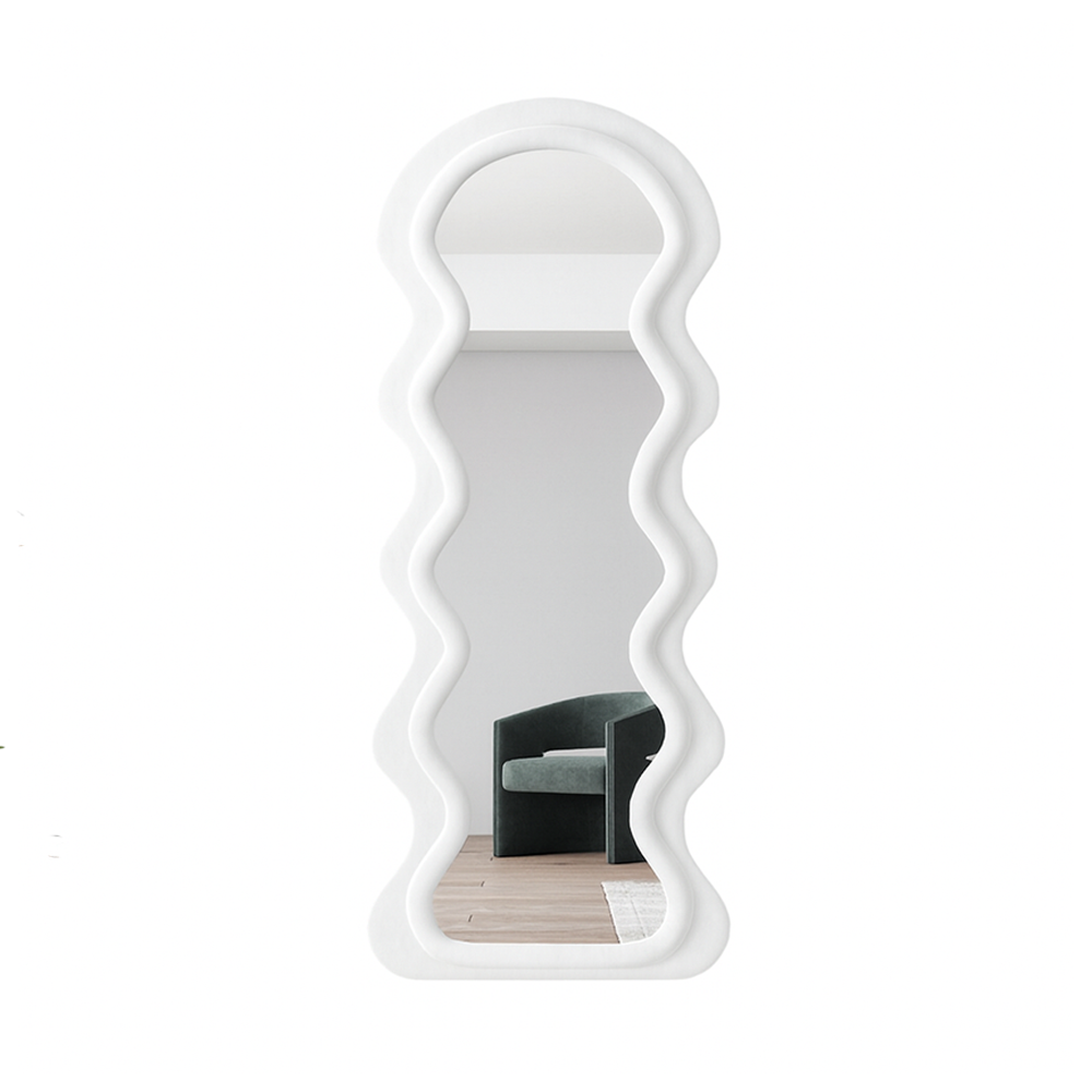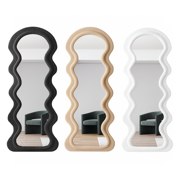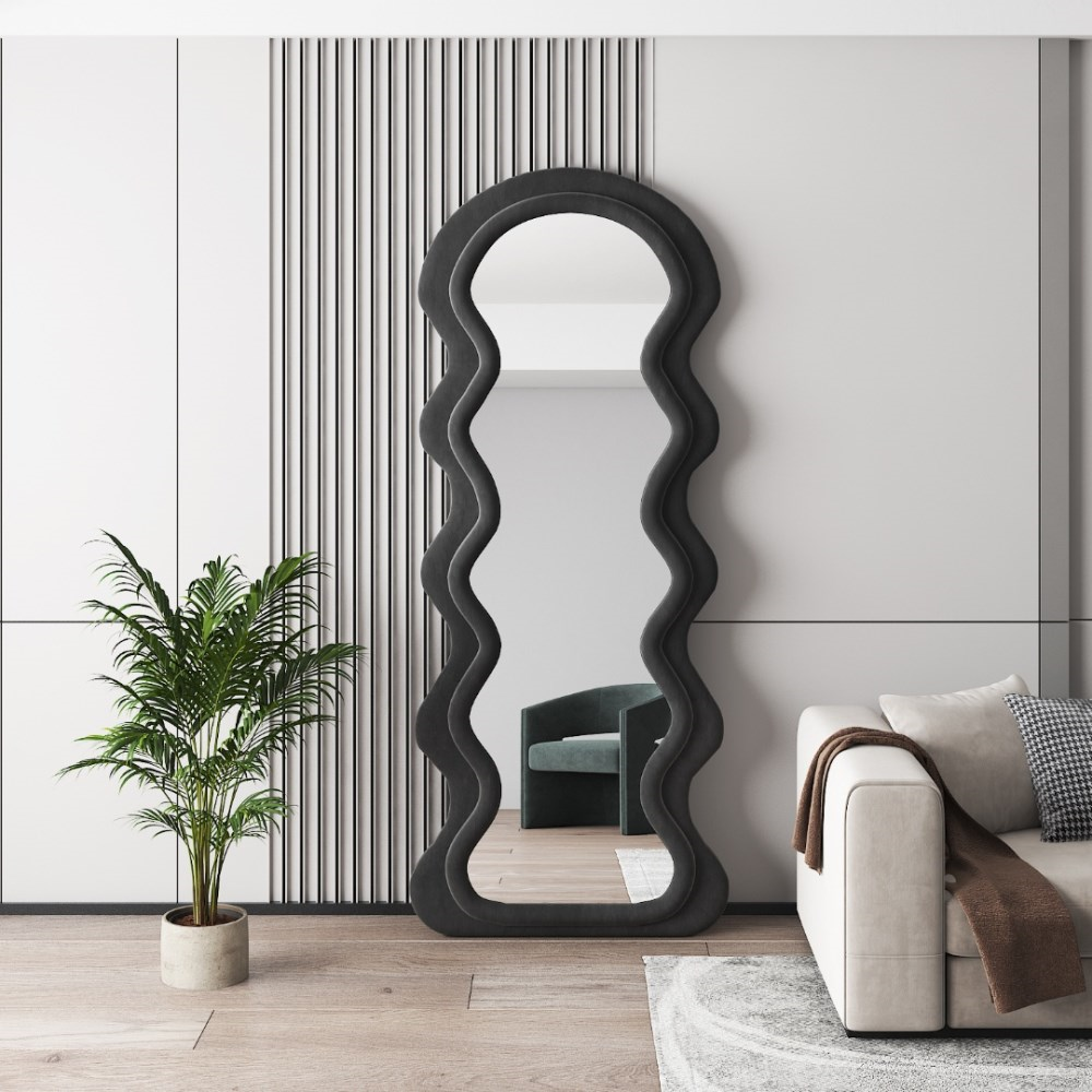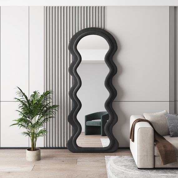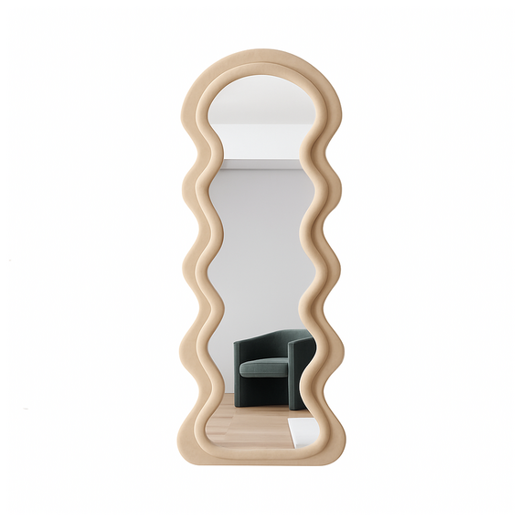 დეკორატიული იატაკის სარკე ტალღოვანი ჩარჩოთი თანამედროვე აქცენტია ინტერიერში, რომელიც აერთიანებს ესთეტიკას, ფუნქციურობას და ორიგინალურ ფორმას. ტალღოვანი, მოცულობითი ჩარჩო ქმნის დიზაინერული არტ-ობიექტის ეფექტს, ხოლო დიდი ასახვის ზედაპირი ვიზუალურად ზრდის სივრცეს და ოთახს მეტ სინათლესა და სიღრმეს მატებს. სარკე იდეალურად ერწყმის მინიმალისტურ, მოდერნ, სკანდინავსა და არტ-დეკოს სტილებს. შესაფერისია შემოსასვლელის, საძინებლის, გარდერობის ან მისაღები ოთახისთვის სადაც საჭიროა გამოკვეთილი დეკორატიული აქცენტი და პრაქტიკული გამოყენება.