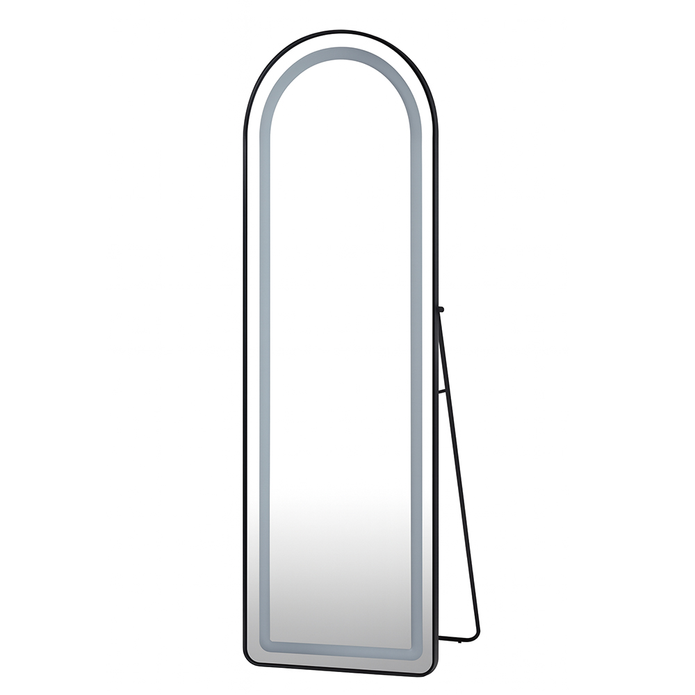 ეს იატაკზე დასადგმელი სარკე ინტეგრირებული LED განათებით გამოირჩევა ელეგანტური თაღოვანი ფორმითა და თანამედროვე მინიმალისტური დიზაინით. ჩარჩოს შიდა კონტურზე განთავსებული LED განათება უზრუნველყოფს რბილ, თანაბარ და თვალისთვის კომფორტულ სინათლეს, რაც იდეალურია მაკიაჟისთვის, ყოველდღიური მოვლისთვისა და ზუსტი ვიზუალური დეტალების დასანახად.