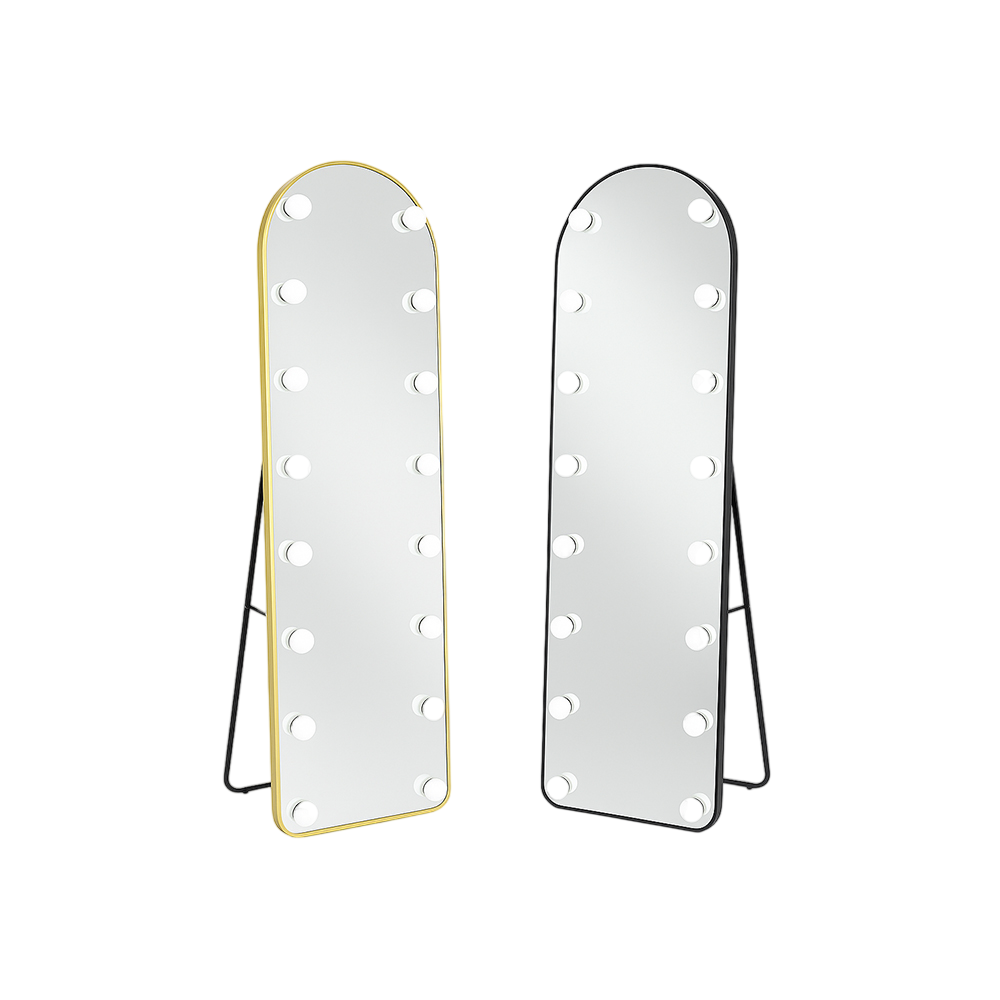 ეს იატაკზე დასადგმელი სარკეები ინტეგრირებული განათებით გამოირჩევა ელეგანტური, თაღოვანი ფორმითა და თანამედროვე დიზაინით, რაც სივრცეს პროფესიონალურ და ესთეტიკურ იერს ანიჭებს. ჩარჩოს გარშემო განთავსებული მრგვალი ნათურები უზრუნველყოფს თანაბარ და რბილ განათებას, რაც იდეალურია მაკიაჟის, მოვლისა და ყოველდღიური გამოყენებისთვის.