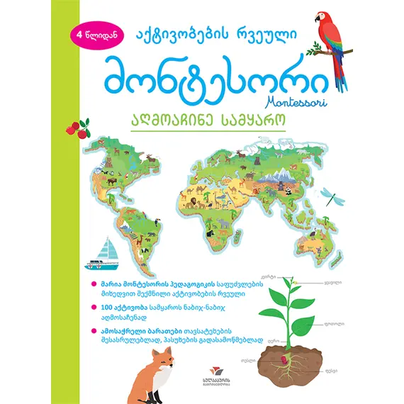 კეთილი იყოს თქვენი მობრძანება მონტესორის პედაგოგიკის მიხედვით შექმნილ ჩვენს კურსზე! ჩვენ მიერ შემოთავაზებული მრავალფეროვანი აქტივობები 4 წლისა და უფროსი ასაკის ბავშვებს სამყაროს ნაბიჯ-ნაბიჯ აღმოჩენაში დაეხმარება.რვეულის პირველ ნაწილში ბავშვი თამაშ-თამაშით შეისწავლის ცოცხალ სამყაროს, მცენარეების, ცხოველებისა და ადამიანის აგებულებას; მცენარის სასიცოცხლო ციკლს; ყოვლისმჭამელი ცხოველების კვებით რაციონს.რვეულის მეორე ნაწილში ბავშვი დედამიწისა და სამყაროს გასაცნობად მთელ მსოფლიოსა და კოსმოსში „იმოგზაურებს“.აქტივობები მონტესორის მიერ შემუშავებულ პროგრესირებადი პედაგოგიკის საფუძვლებს ემყარება.რვეულს თან ერთვის ბარათები ადამიანის სხეულის ნაწილების, მცენარეებისა და ცხოველების გამოსახულებით, გეოგრაფიული რუკები და სხვა.