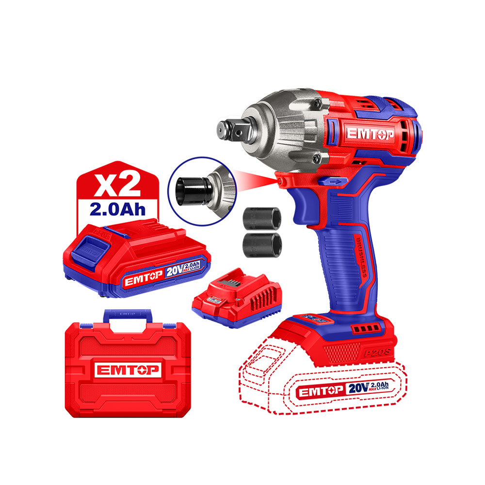 Brushless motorVoltage:20VSquare drive:1/2""No-load speed:0-1300/0-2300rpmImpact rate:0-2000/0-3300bpmMax torque:300NMWith 2pcs 2.0Ah battery packWith 1pcs chargerCharge volts:220-240V~50/60Hz Integrated work lightLED battery power indicatorWith 2pcs sockets(19 21mm)Packed by plastic box