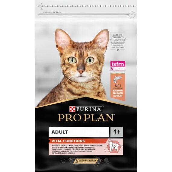 Purina Pro Plan Adult Vital Functions with Salmon – მშრალი საკვები ზრდასრული კატებისთვის, ორაგულის არომატით, იმუნური ფუნქციის, თირკმლებისა და ტვინის მხარდაჭერისთვის.