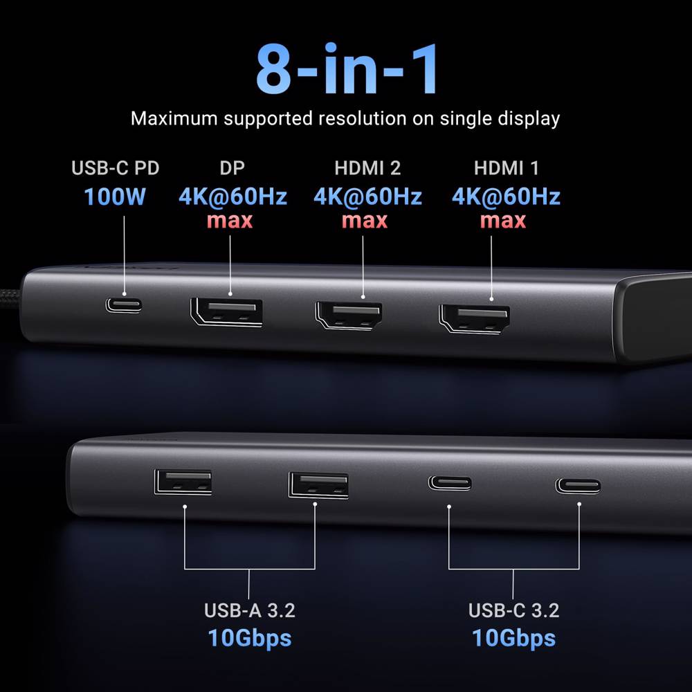 USB-C ჰაბი UGREEN CM639 (35625) Revodok 308, HDMI, DP, Type-C, USB-A, PD, Grey