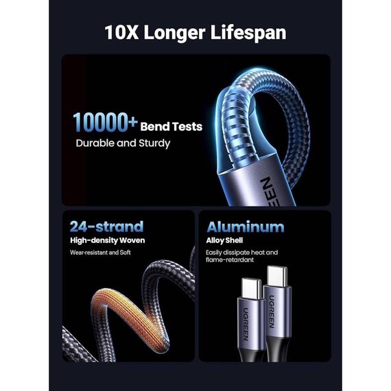 USB კაბელი UGREEN US561 (35087), 100W, Type-C to Type-C, 1.5m, Grey