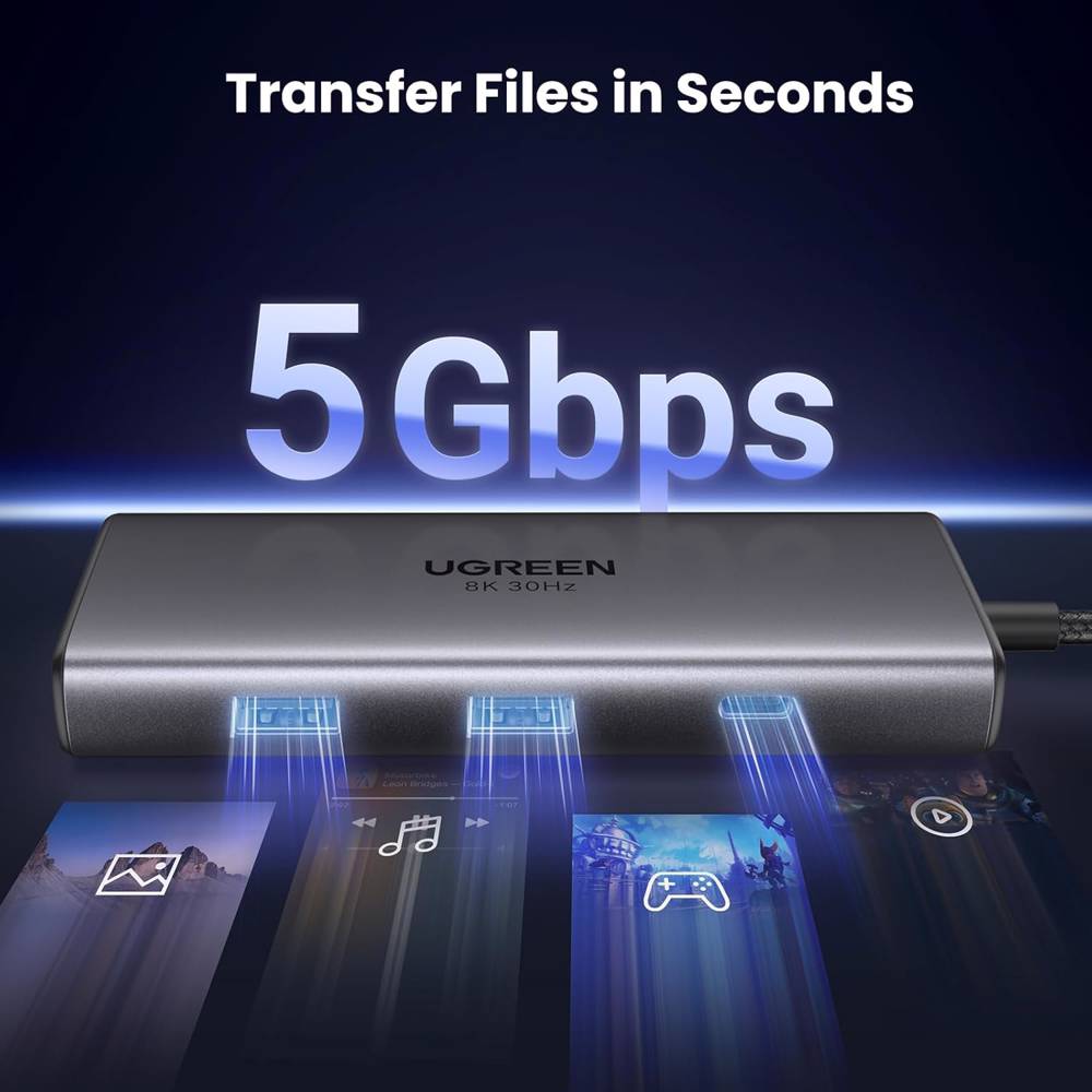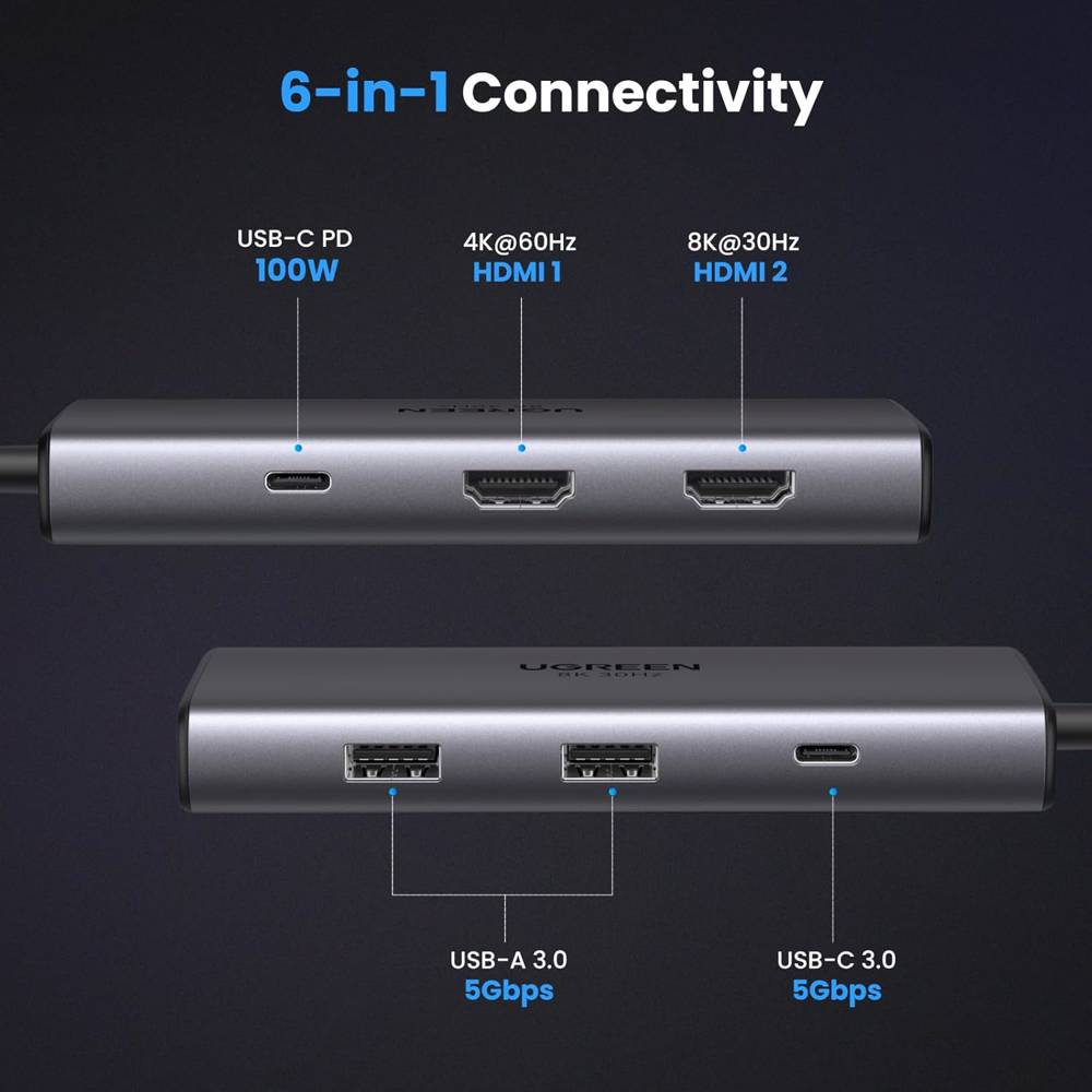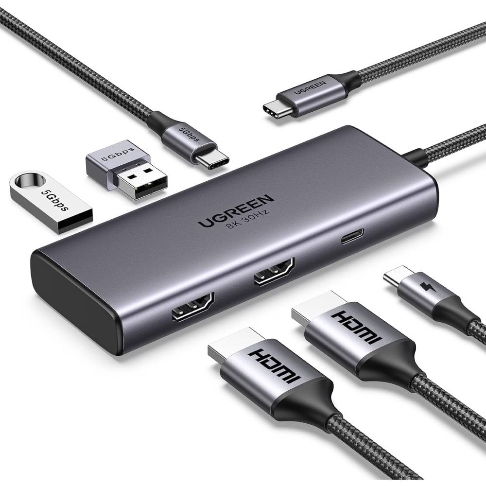 USB-C ჰაბი UGREEN CM498 (15852) Revodok 206, 2xHDMI, USB, Type-C, HUB, Grey
