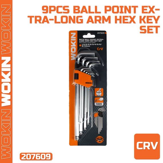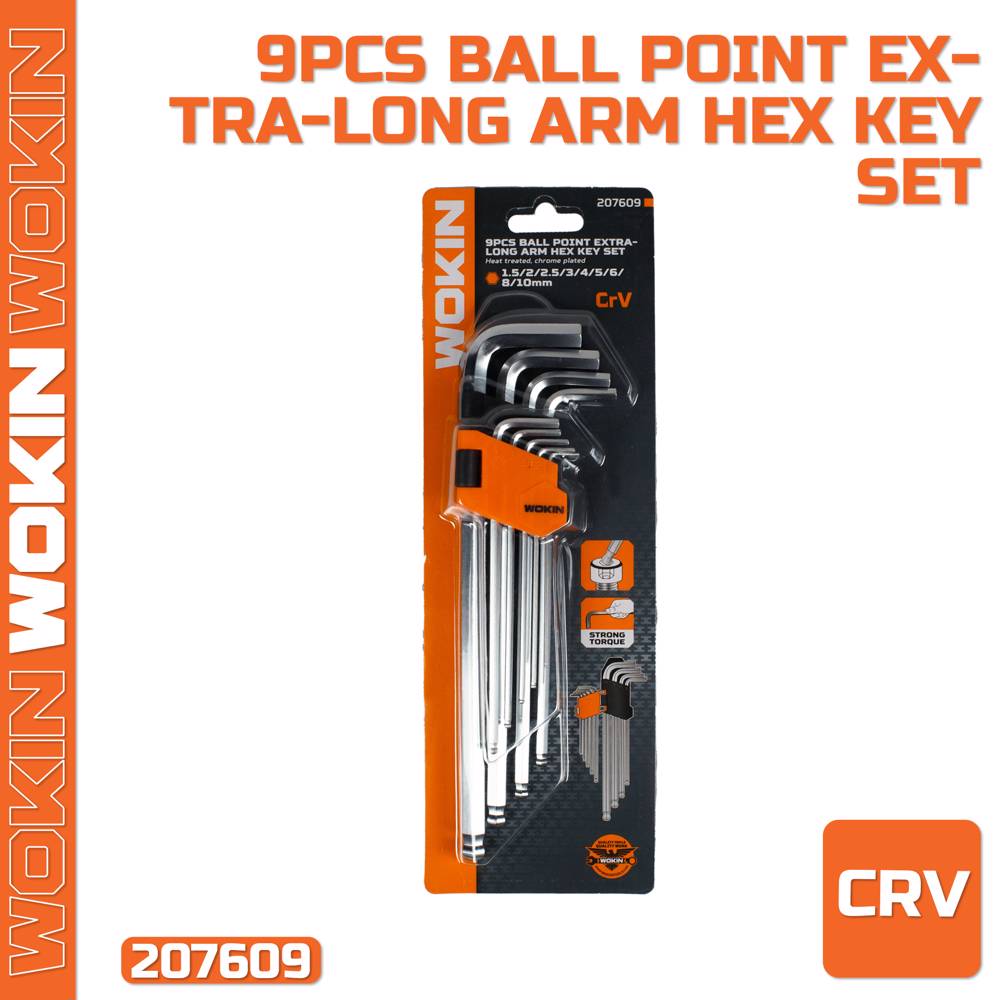 ექვსკუთხა სახრახნისის ნაკრები Wokin 207609, 9Pcs BALL POINT EXTRA-LONG ARM HEX KEY SET, Silver/Black