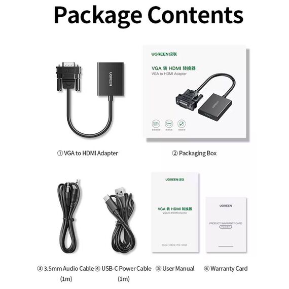 ადაპტერი UGREEN CM513 (50945), VGA To HDMI Adapter With 3.5mm And Type-C, 0.15cm, Black