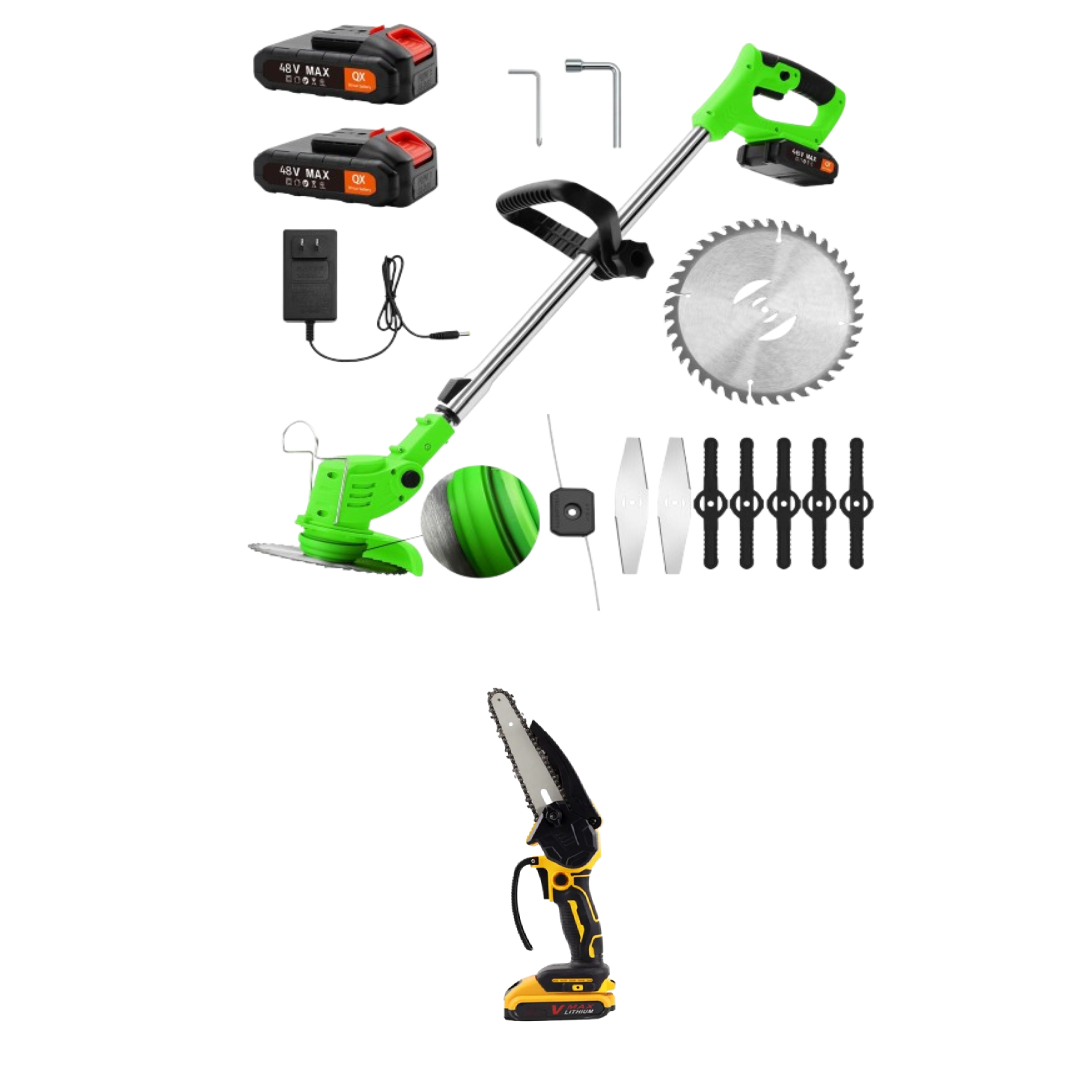 ბალახის სათიბი 2 დიდი ელემენტით მწვანე CTRIM & ელექტრო ჯაჭვური ხერხი 2 ელემენტით SAPAT CTRIM