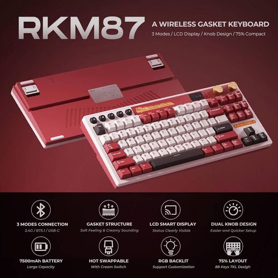 კლავიატურა Royal Kludge RK M87 RGB Mechanical Keyboard, Cream Switch, Hot Swappable, Wireless, Type-C, Bluetooth, 2.4GHz, Famicom