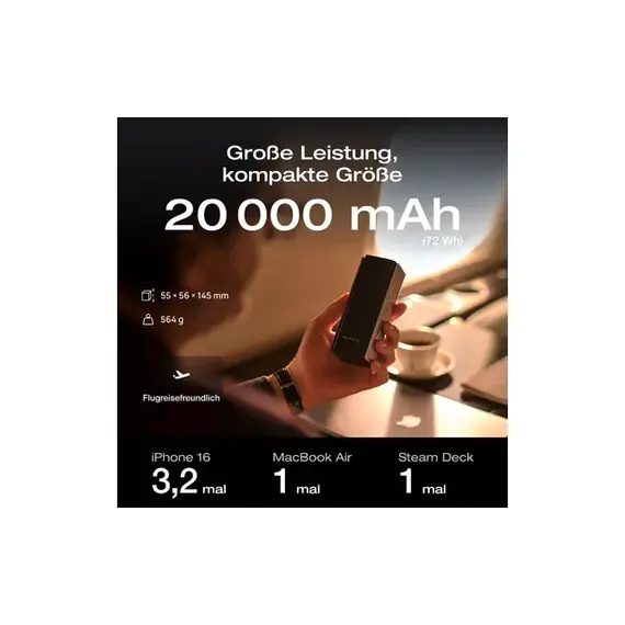 სიმძლავრე: 20,000 mAh (72 Wh) სრული სიმძლავრით