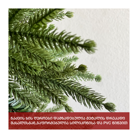 ბუნებრივის მსგავსი ნაძვის ხე: დრეკადი მეტალის ტოტებით და ჯანმრთელობისთვის უსაფრთხო მასალისგან დამზადებული შერეული ორი ფერის, სილიკონის და PVC წიწვით . მეტალის მყარი სადგამით და მთავარი ღერძით.