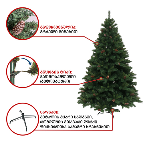 ნაძვის ხე: გაფორმებული გრძელი გირჩებით. გამძლე დრეკადი მეტალის ტოტებით და ჯანმრთელობისთვის უსაფრთხო მასალისგან დამზადებული წიწვებით. მეტალის მყარი სადგამით და მთავარი ღერძით