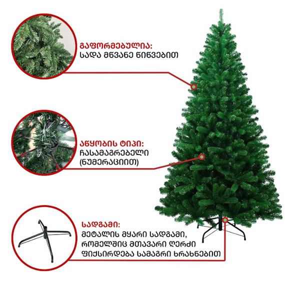 სადა მწვანე ნაძვის ხე: გამძლე დრეკადი მეტალის ტოტებით და ჯანმრთელობისთვის უსაფრთხო მასალისგან დამზადებული წიწვებით. მეტალის მყარი სადგამით და მთავარი ღერძით.