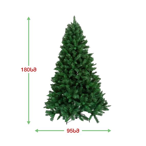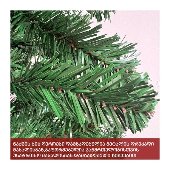 სადა მწვანე ნაძვის ხე: გამძლე დრეკადი მეტალის ტოტებით და ჯანმრთელობისთვის უსაფრთხო მასალისგან დამზადებული წიწვებით. მეტალის მყარი სადგამით და მთავარი ღერძით.