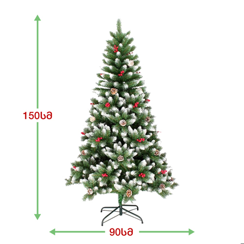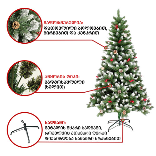 ნაძვის ხე: დათოვლილი ბოლოებით, გაფორმებული გირჩებით და კენკრით. გამძლე დრეკადი მეტალის ტოტებით და ჯანმრთელობისთვის უსაფრთხო მასალისგან დამზადებული წიწვებით. მეტალის მყარი სადგამით და მთავარი ღერძით.