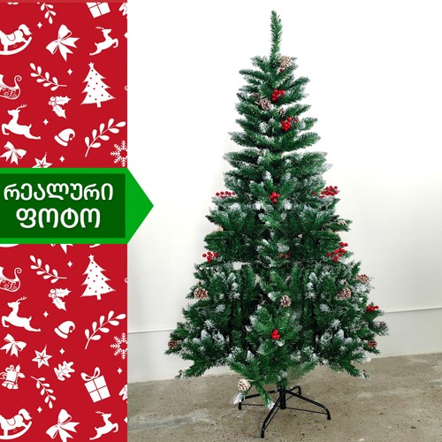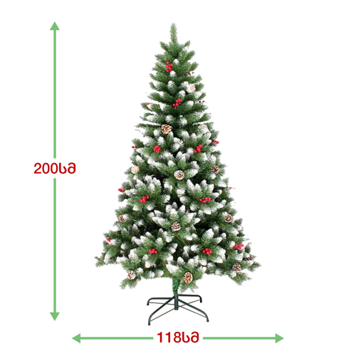 ნაძვის ხე: დათოვლილი ბოლოებით, გაფორმებული გირჩებით და კენკრით. გამძლე დრეკადი მეტალის ტოტებით და ჯანმრთელობისთვის უსაფრთხო მასალისგან დამზადებული წიწვებით. მეტალის მყარი სადგამით და მთავარი ღერძით.