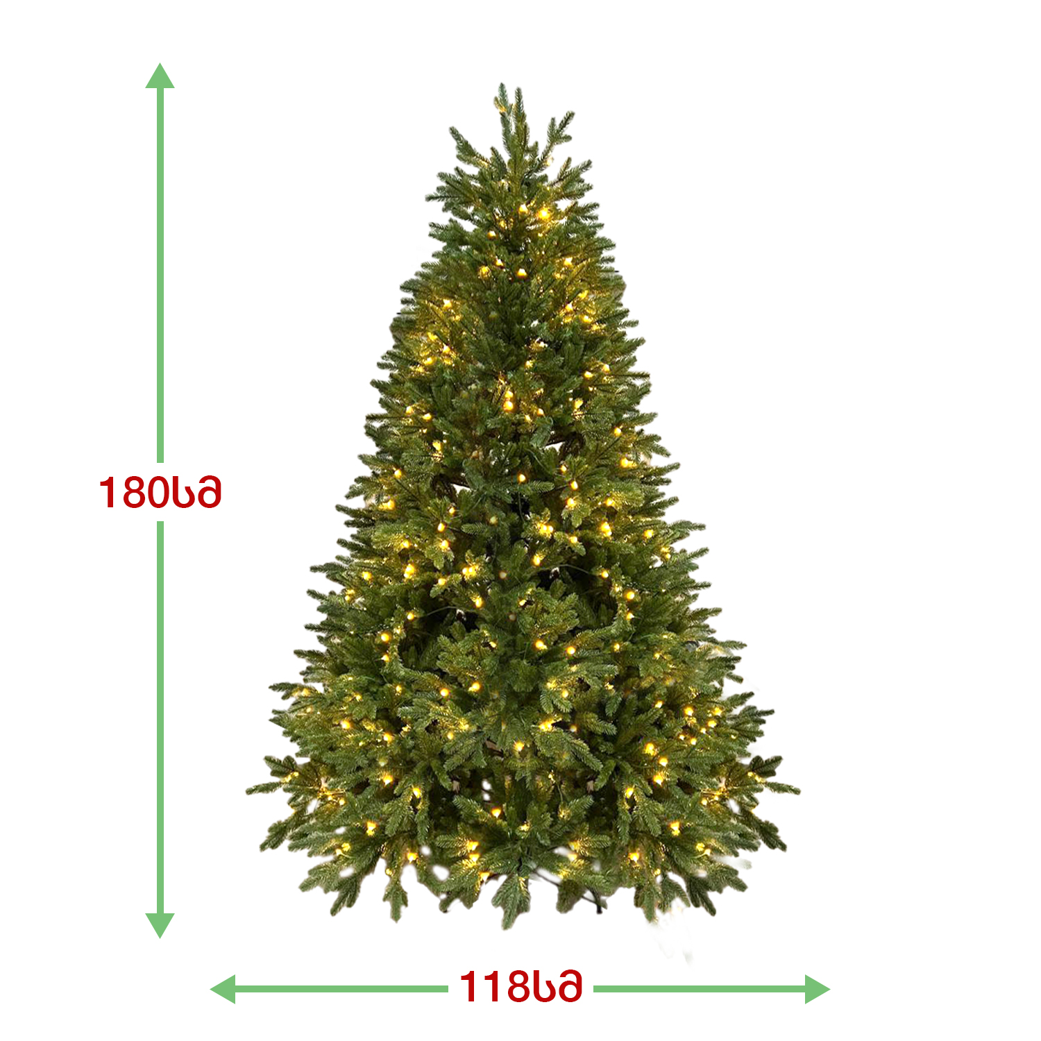 ბუნებრივის მსგავსი მწვანე ნაძვის ხე: ინტეგრირებული LED ნათურებით, დამზადებული 100% სილიკონის წიწვებით. გამძლე დრეკადი მეტალის ტოტებით და ჯანმრთელობისთვის უსაფრთხო მასალისგან დამზადებული წიწვებით. მეტალის მყარი სადგამით და მთავარი ღერძით.