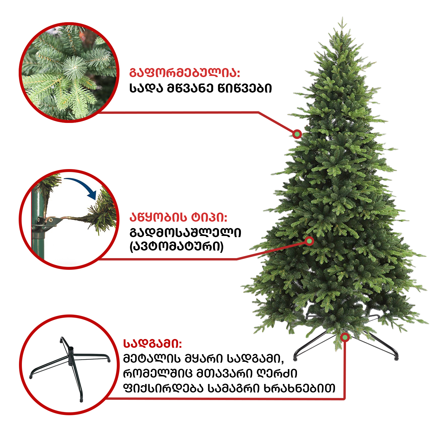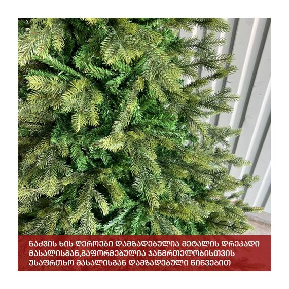 ბუნებრივის მსგავსი ნაძვის ხე: დრეკადი მეტალის ტოტებით და ჯანმრთელობისთვის უსაფრთხო მასალისგან დამზადებული შერეული ორი ფერის, სილიკონის და PVC წიწვით. მეტალის მყარი სადგამით და მთავარი ღერძით
