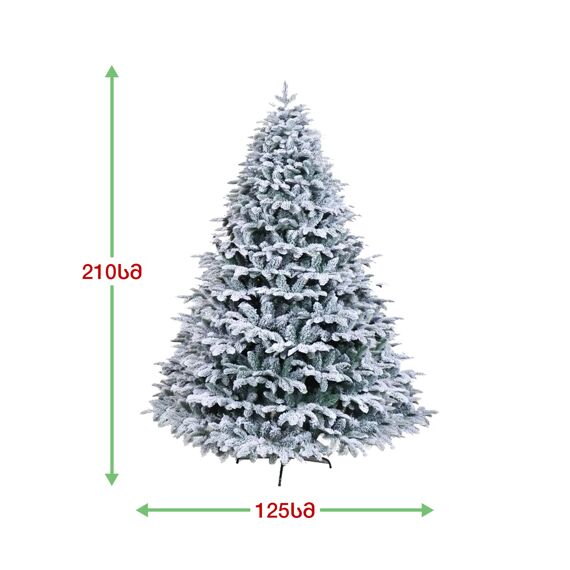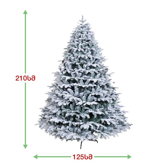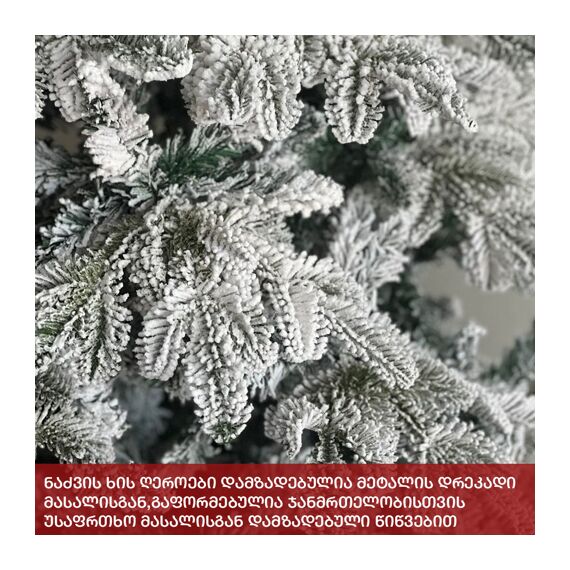 ბუნებრივის მსგავსი დათოვლილი ნაძვის ხე: დრეკადი მეტალის ტოტებით და ჯანმრთელობისთვის უსაფრთხო მასალისგან დამზადებული სილიკონის და PVC წიწვით . მეტალის მყარი სადგამით და მთავარი ღერძით.