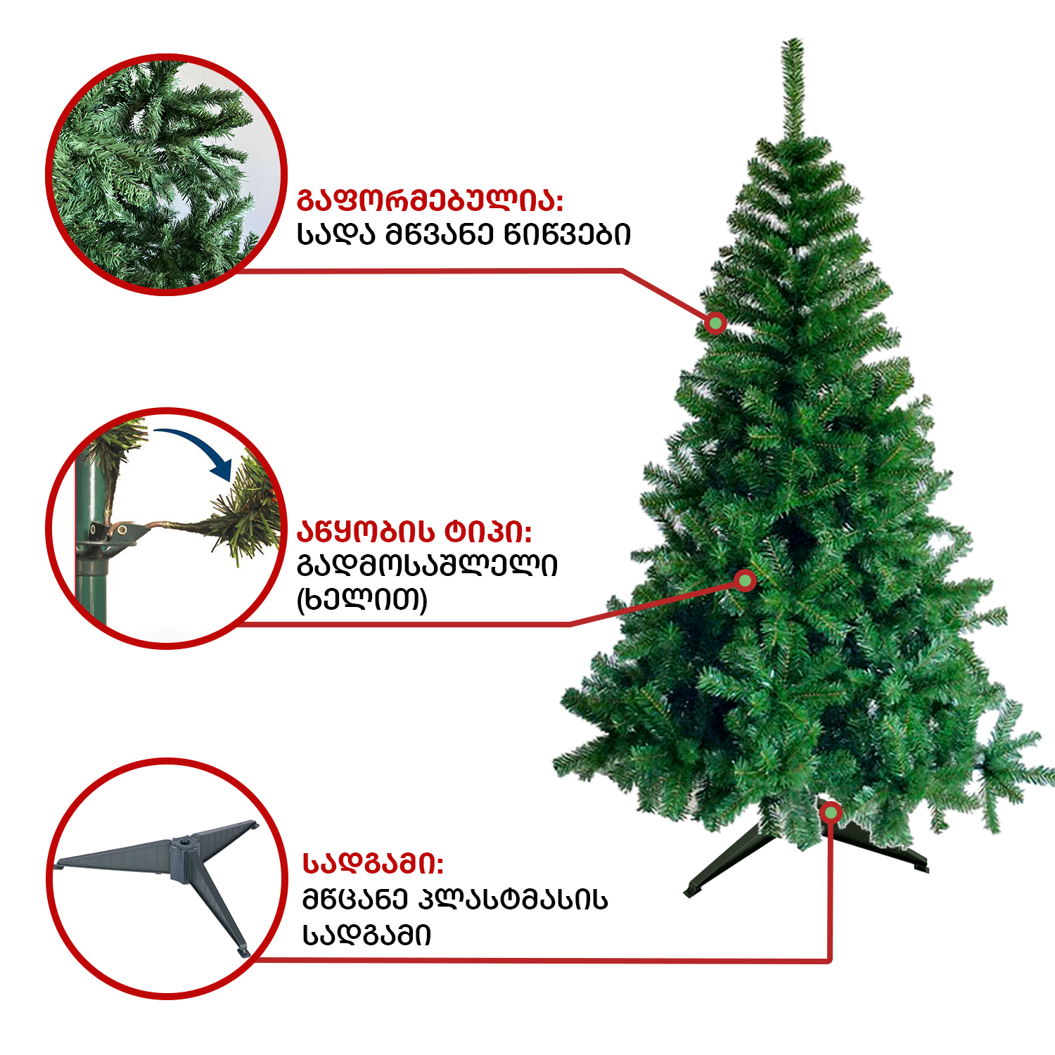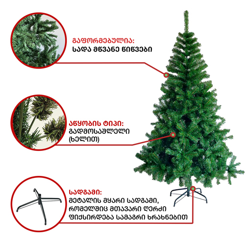 ნაძვის ხე გამძლე: დრეკადი მეტალის ტოტებით და ჯანმრთელობისთვის უსაფრთხო მასალისგან დამზადებული წიწვებით. მეტალის მყარი სადგამით და მთავარი ღერძით.