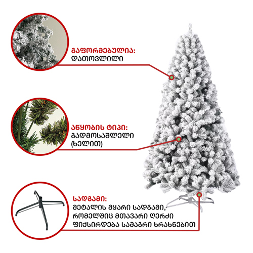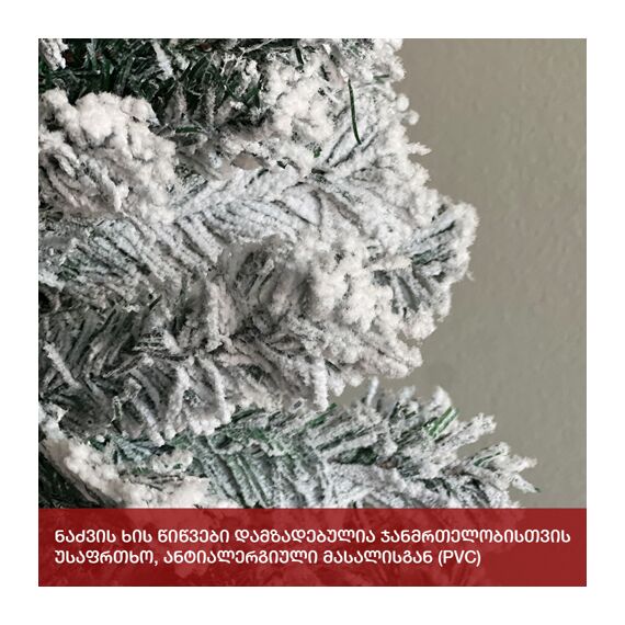 დათოვლილი ნაძვის ხე: გამძლე დრეკადი მეტალის ტოტებით და ჯანმრთელობისთვის უსაფრთხო მასალისგან დამზადებული წიწვებით. მეტალის მყარი სადგამით და მთავარი ღერძით.