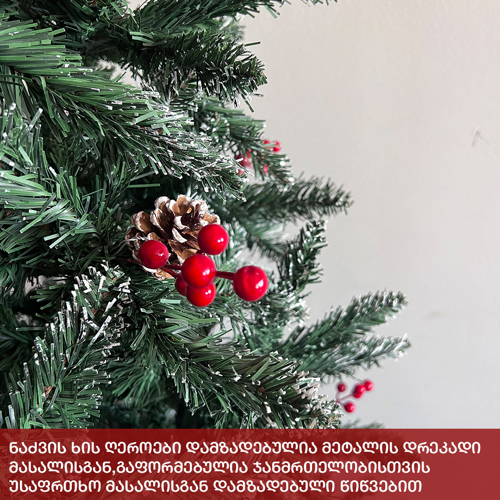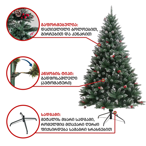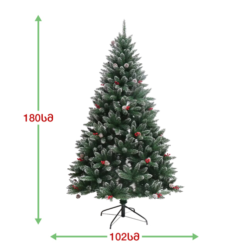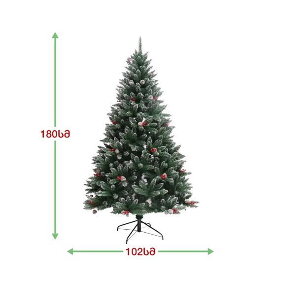 ნაძვის ხე დათოვლილი ბოლოებით, გაფორმებული გირჩებით და კენკრით. გამძლე დრეკადი მეტალის ტოტებით და ჯანმრთელობისთვის უსაფრთხო მასალისგან დამზადებული წიწვებით. მეტალის მყარი სადგამით და მთავარი ღერძით.