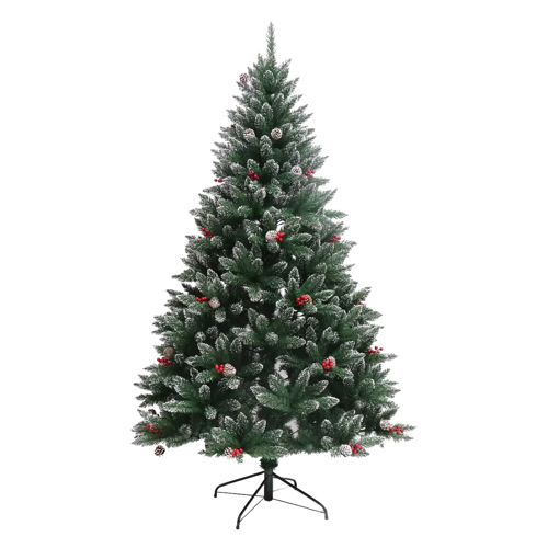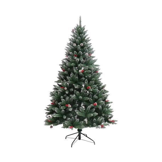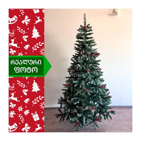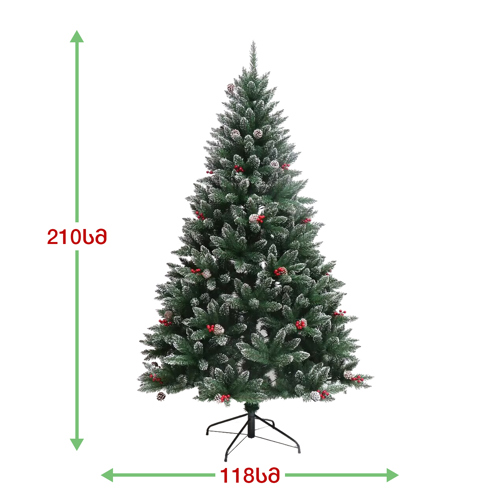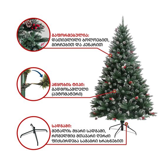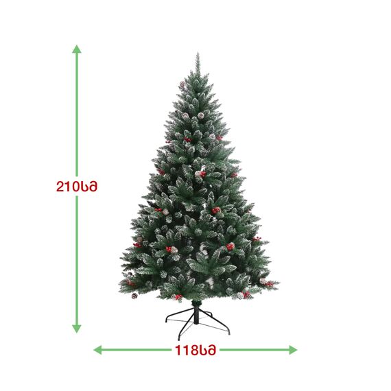 ნაძვის ხე: დათოვლილი ბოლოებით, გაფორმებული გირჩებით და კენკრით. გამძლე დრეკადი მეტალის ტოტებით და ჯანმრთელობისთვის უსაფრთხო მასალისგან დამზადებული წიწვებით. მეტალის მყარი სადგამით და მთავარი ღერძით.
