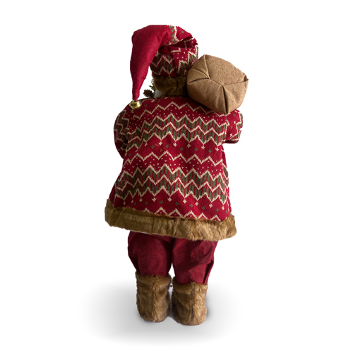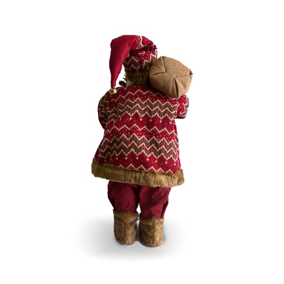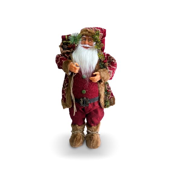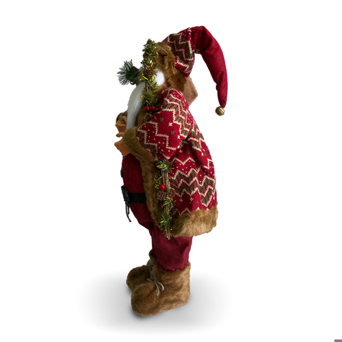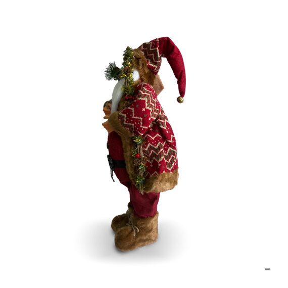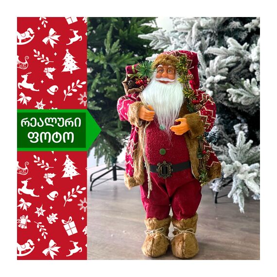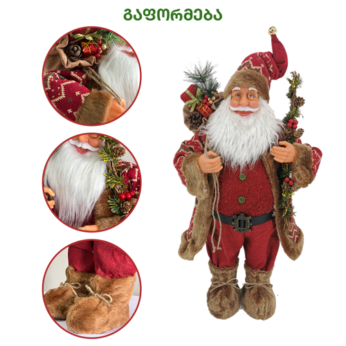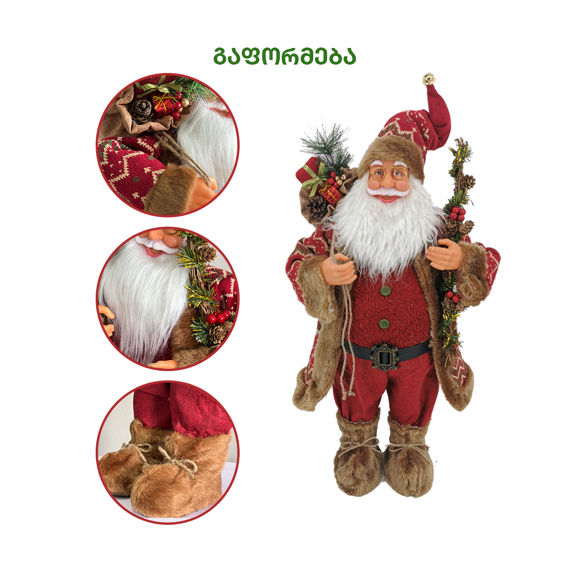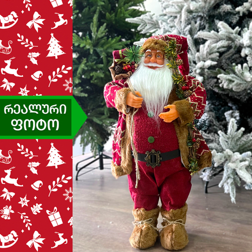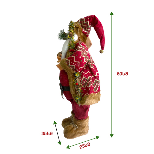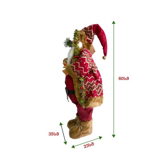 60სმ სიმაღლის სანტა კლაუსი: წითელ კოსტუმში. ყავისფერი ჩექმებით და პალტოთი. გაფორმებული დეკორაციებით: ზურგზე გადაკიდებული ხურჯინი და ხელში ჯადოსნური კვერთხი.