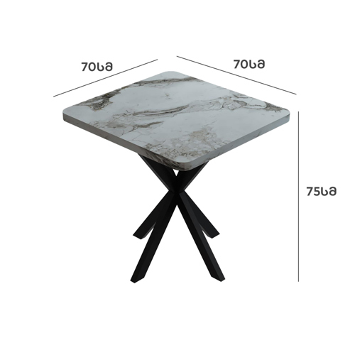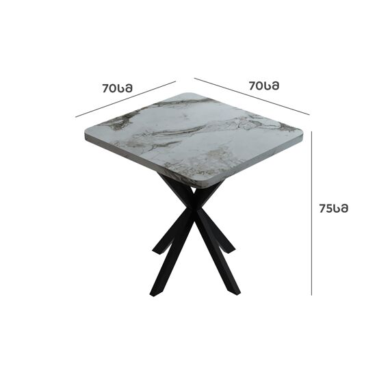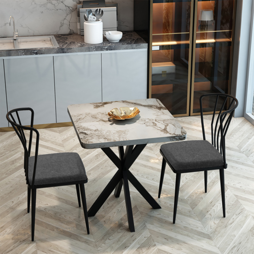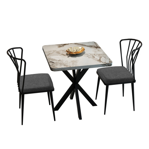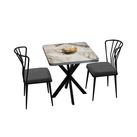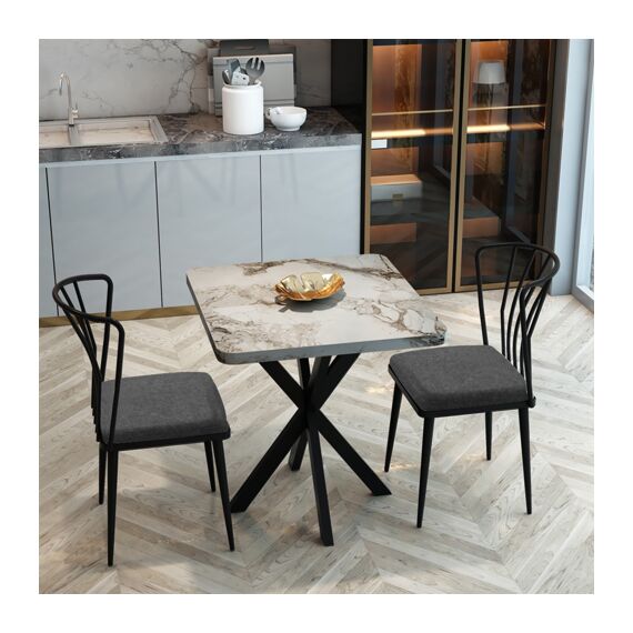 განაახლეთ თქვენი სასადილო სივრცე ამ თანამედროვე 3-ნაწილიანი სასადილო კომპლექტით, რომელიც მოიცავს ელეგანტურ კვადრატულ მაგიდას და ორ თანამედროვე სკამს. მაგიდა გამოირჩევა მარმარილოს იერსახის მქონე ზედაპირით ბუნებრივი ნაქსოვი ვენებით, რაც ნებისმიერ სივრცეს ელეგანტურობას მატებს. მისი შავი, გადაჯვარედინებული მეტალის ფეხები უზრუნველყოფს სტაბილურობას და თანამედროვე სტილს.