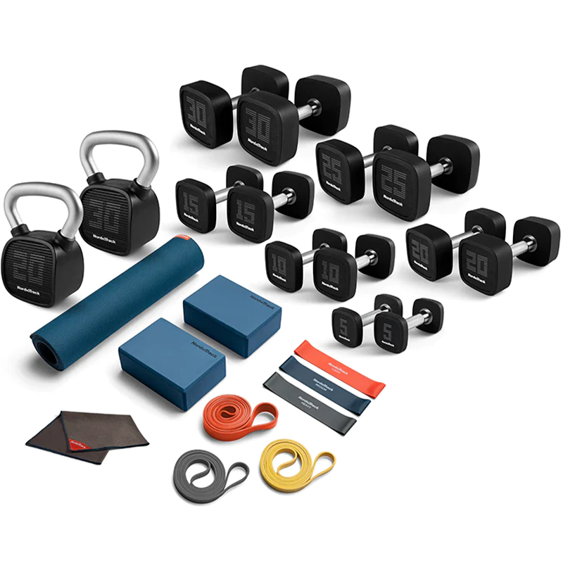 კომპლეკტაციაში: 6 წყვილი ჰანტელი (2-დან 13 კგ-მდე); 2 X გირი (9 კგ, 13 კგ); 13 X ჯვარედინი რეზინი (აზიდვებისთვის, მკლავებისთვის, ფეხებისთვის და ა.შ); 3 X რეზინი (საჯდმოსთვის და ბარძაყებისთვის) ; სავარჯიშო ხალიჩა; 2 X იოგას აგური; მიკროფიბრას პირსახოცი