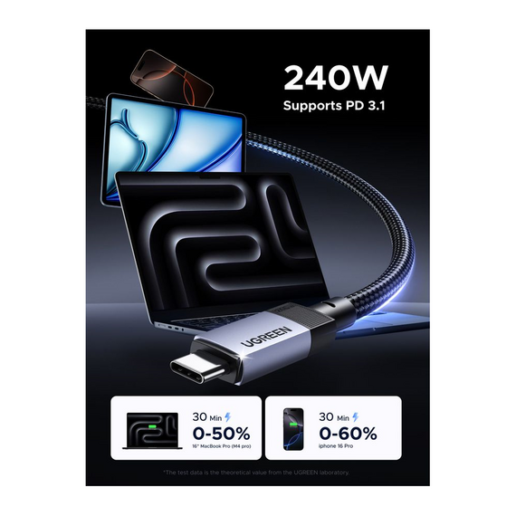 USB კაბელი UGREEN L705 (65175), 240W, Type-C to Type-C Cable, 1m, Grey