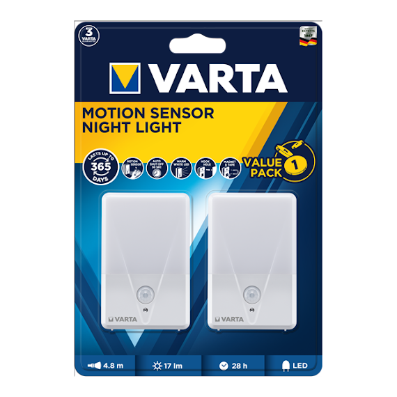ძლებს 365 დღემდე, თუ შუქი ჩართულია 30 წამით, დღეში ხუთჯერ. აქვს მოსახერხებელი მოძრაობის სენსორი, რომელიც უზრუნველყოფს სიბნელეში ხილვადობას, ნებისმიერ დროს. VARTA-ს აქვს თბილი თეთრი LED განათება სასიამოვნო ეფექტისთვის. გააჩნია დაყენების სამი ვარიანტი: კაუჭის ხვრელი, მაგნიტი და წებოვანი ლენტი. შეფუთვაში მოიცავს 2 ცალ განათებას.