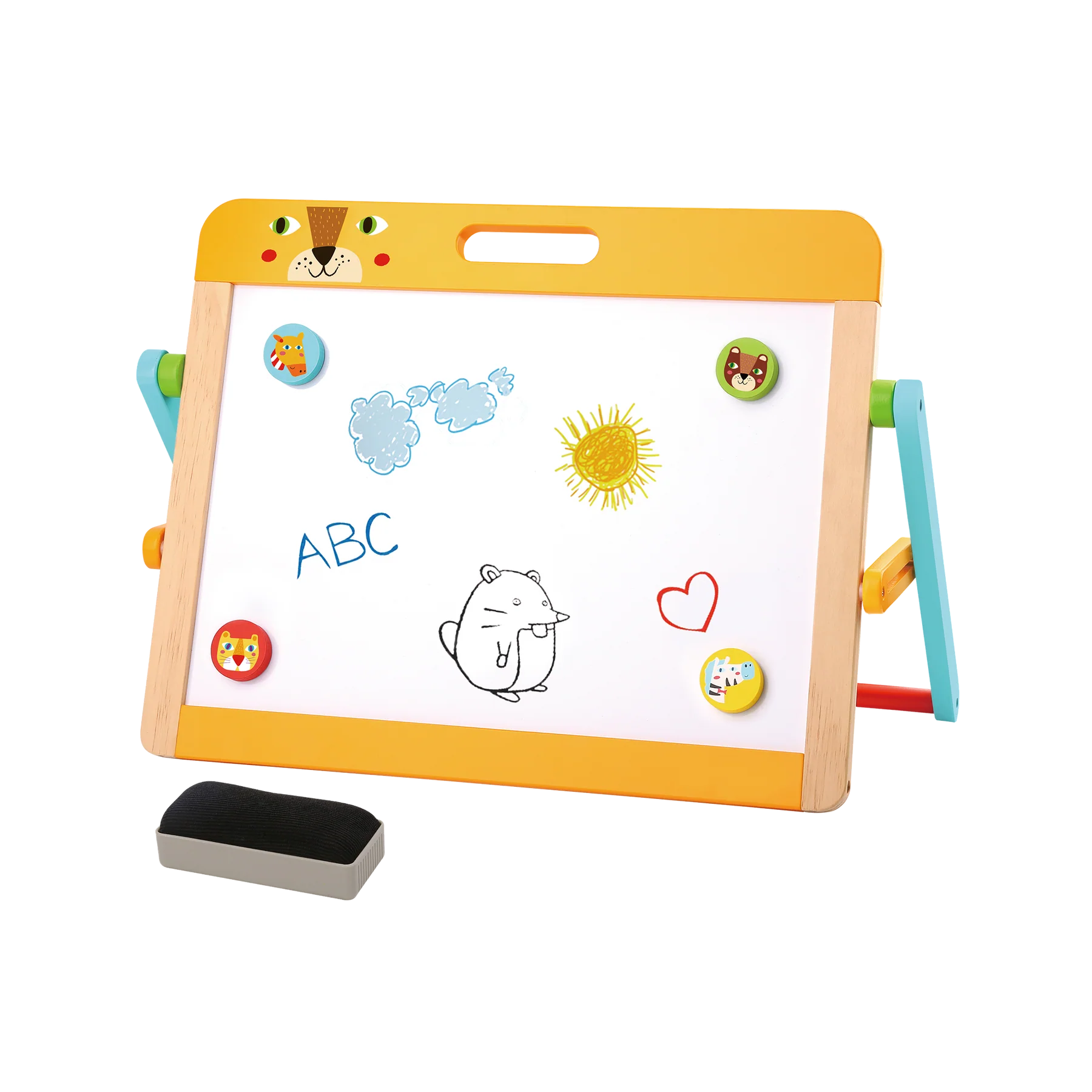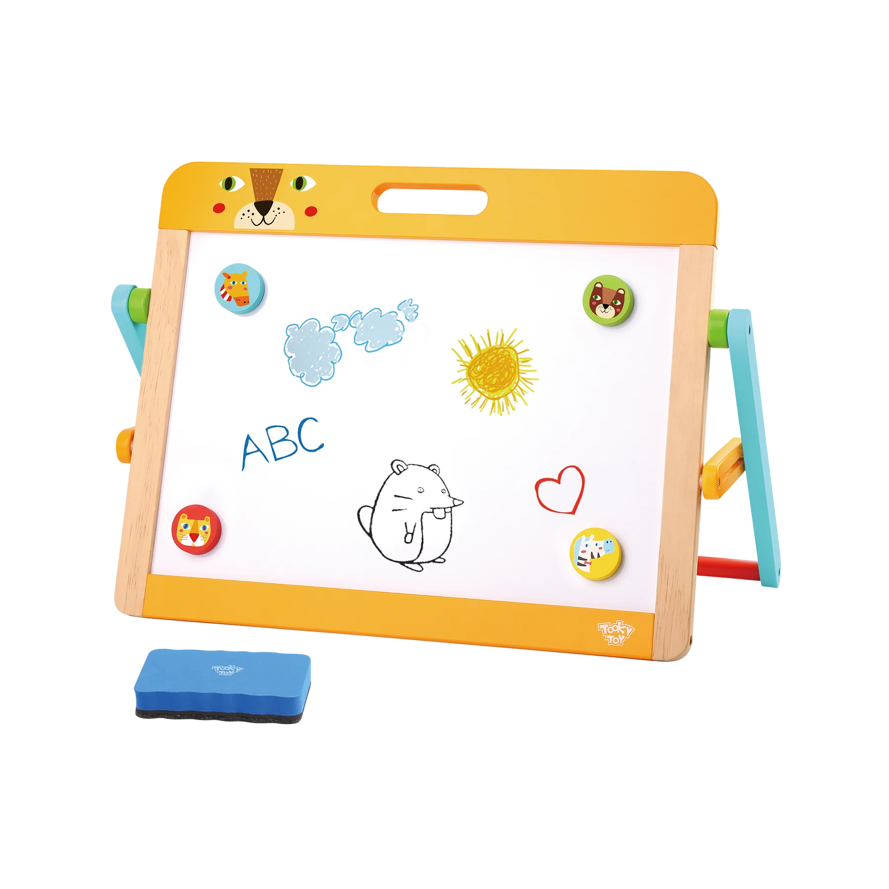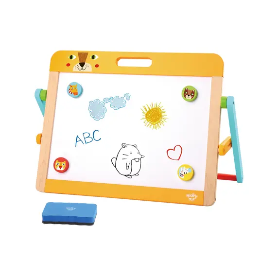 დამატებითი ინფორმაცია: TOOKY TOY PREMIUM-ის ხის სახატავი დაფა შესანიშნავი ინსტრუმენტია ბავშვებისთვის, რომ თვითგამოხატვა და შემოქმედებითი უნარები თამაშით განავითარონ. ეს კომპაქტური მაგიდის თაროზე დასადგმელი დაფა ერთ მხარეს დაფარულია თეთრი მარკერის ზედაპირით, მეორე მხარეს კი – შავ დაფაზე ცარცით დასაწერად, რაც ხელს უწყობს მრავალმხრივ შემოქმედებით თამაშს. თამაში ეხმარება ბავშვს მოტორიკის, კონცენტრაციისა და ფანტაზიის განვითარებაში. Montessori-დან შთაგონებული დიზაინი კი აძლიერებს დამოუკიდებელ შემეცნებას.