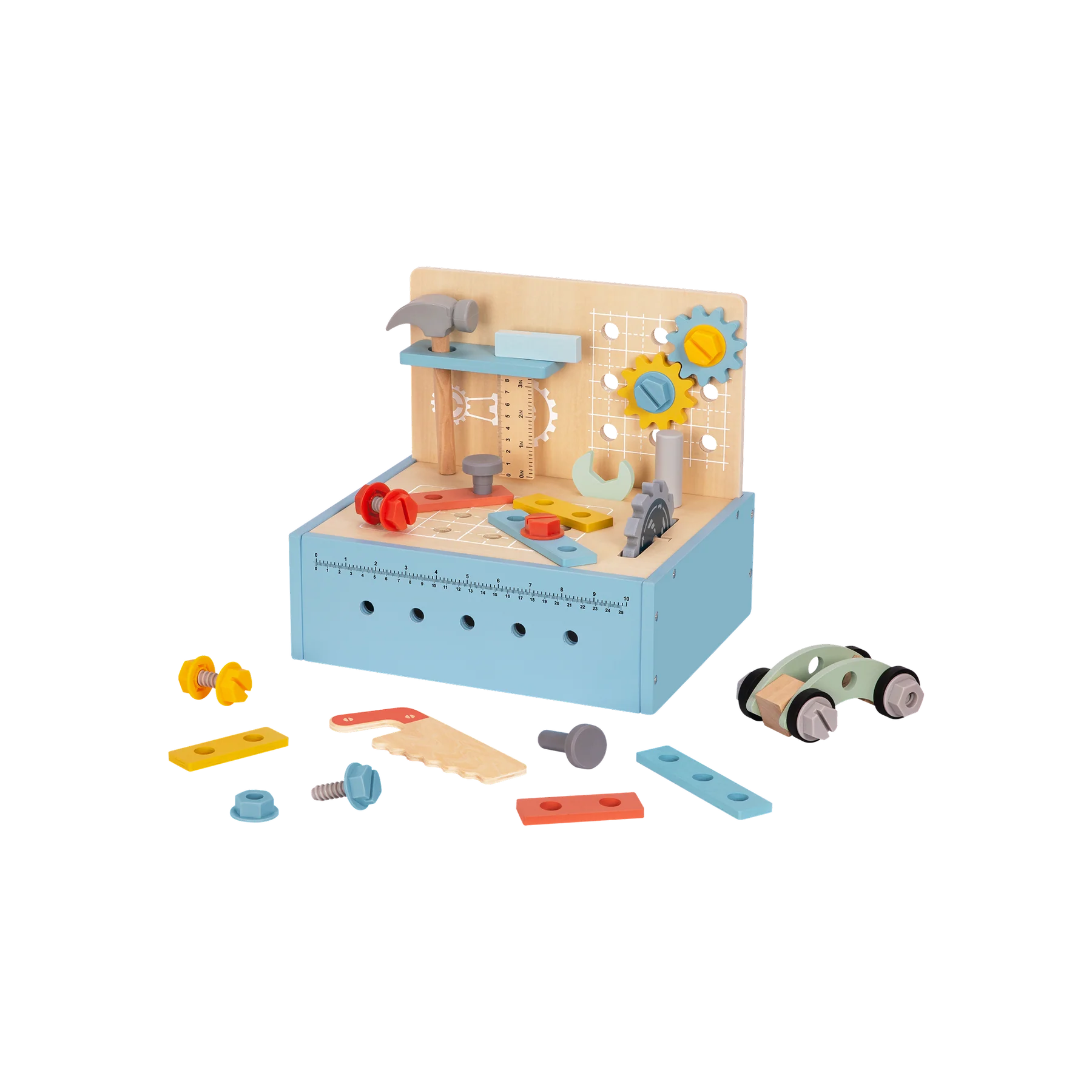 აღწერა: პატარა ხელოსნის დიდი გამოცდილება,TOOKY TOY PREMIUM-ის სამუშაო მაგიდა აძლევს ბავშვს შესაძლებლობას, გამოსცადოს თავი რეალურ საქმიანობაში — გამოიყენოს ჩაქუჩი, ხრახნები, ხის ბურღი და ააწყოს საკუთარი „პროექტები“. ნაკრები შედგება 43 ელემენტისგან და ხელს უწყობს ბავშვის მოტორული უნარების, სივრცითი აზროვნების და პრობლემების გადაჭრის უნარების განვითარებას. Montessori-ით შთაგონებული დიზაინი ხელს უწყობს დამოუკიდებლობას, შემოქმედებითობასა და პრაქტიკული უნარების განვითარებას თამაშის მეშვეობით.