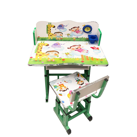 ფერადი მაგიდა ბავშვთა სკამით, რომელიც განკუთვნილია გოგონასთვის, აერთიანებს პრაქტიკულობას, ქმნის სასიამოვნო გარემოს სწავლისა და თამაშისათვის.