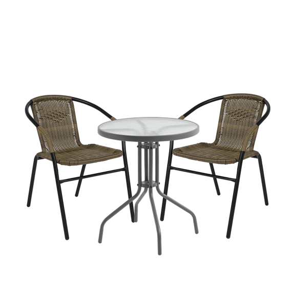 ნაწრთობი მინის მაგიდისა და მოწნული სკამების კომპლექტი მეტალის კარკასით თქვენს ინტერიერსა თუ ექსტერიერს შესძენს მყუდროებას და გამორჩეულ დიზაინს.