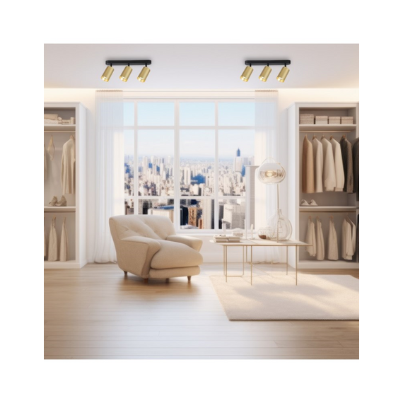 ელეგანტური და თანამედროვე სპოტი შავი ლითონის ძირით და სამი ოქროსფერი ცილინდრული კორპუსით. რეგულირებადი თავები საშუალებას გაძლევთ მიმართოთ შუქს იქ, სადაც ყველაზე მეტად გჭირდებათ, რაც შესანიშნავს ხდის ოთახის კონკრეტული უბნების ხაზგასმას. შავი და ოქროს კომბინაცია ქმნის მდიდრულ და დახვეწილ იერს. ეს პროჟექტორი იდეალურია მისაღები ოთახებში, საძინებლებში ან დერეფნებში გამოსაყენებლად ორიენტირებული და ფუნქციონალური განათების გადაწყვეტის შესაქმნელად.