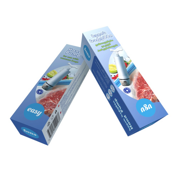Easy-ს ხელის სატუმბი მარტივად ტუმბავს ჰაერს პარკებიდან, რაც იცვას პროდუქტებს ყინულით დამწვრობისგან. მრავალჯერადია და ირეცხება მარტივად.
