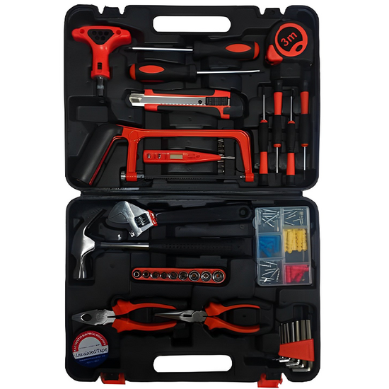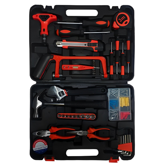 კომპლექტაციაშია: ჩაქუჩი, ქანჩის გასაღები, ბრტყელტუჩა, გრძელცხვირა ბრტყელტუჩა, საიზოლაციო ლენტი, რულეტი, სამშენებლო დანა, 2 X სახრახნისი, ექვსწახნაგა გასაღებების ნაკრები, დამჭერი, ხელის ხერხი, ბიტების ნაკრები