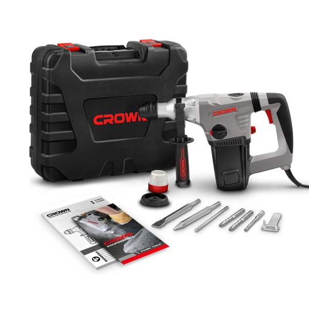 Crown CT18114 განკუთვნილია სხვადასხვა მასალის გასაბურღად და სადემონტაჟო სამუშაოებისთვის. აღნიშნული მოდელი აღჭურვილია დამატებითი სახელურით და ვიბრაციისგან დაცვის სისტემით, რაც ამცირებს დატვირთვას და უზრუნველყოფს მუშაობის მოხერხებულობას. ინსტრუმენტის ფუნქციონალურობა მიიღწევა სამი რეჟიმის არსებობით: ბურღვა, ბურღვა დარტყმით და დარტყმა. რედუქტორის ლითონის კორპუსი უზრუნველყოფს სითბოს ეფექტურ მოცილებას და შიდა კომპონენტების დაცვას მექანიკური დაზიანებისგან, რაც არის ხანგრძლივი სამუშაო რესურსის გარანტია.