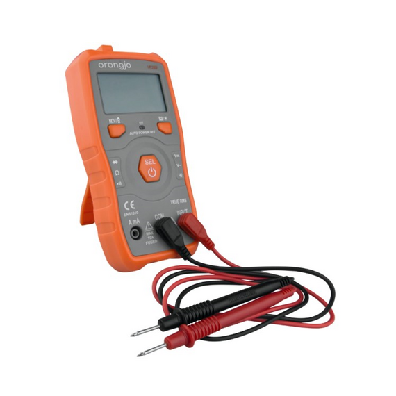 ORANGJO ციფრული მრიცხველი ავტომატური საზომი დიაპაზონის შერჩევით. NCV ძაბვის დეტექტორი. CAT. III. გაზომვები: AC/DC დენი, AC/DC ძაბვა, წინააღმდეგობა, კონდენსატორის სიმძლავრე, დიოდის ტესტი, მიკროსქემის უწყვეტობის ტესტი. ზუმერი. HOLD ფუნქცია. განათება + ფანარი.