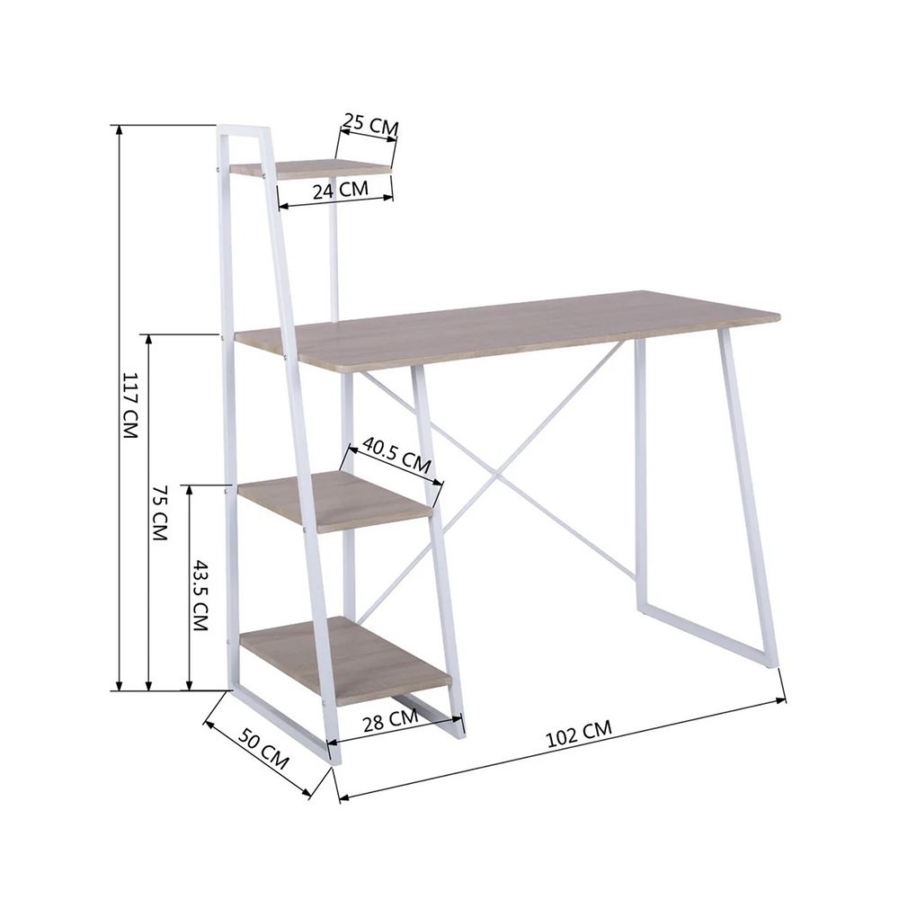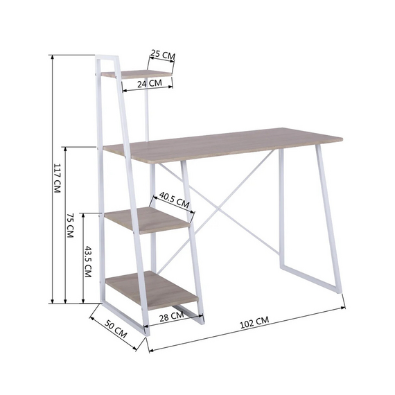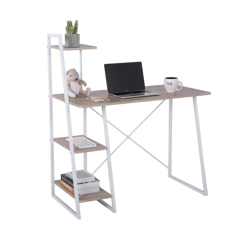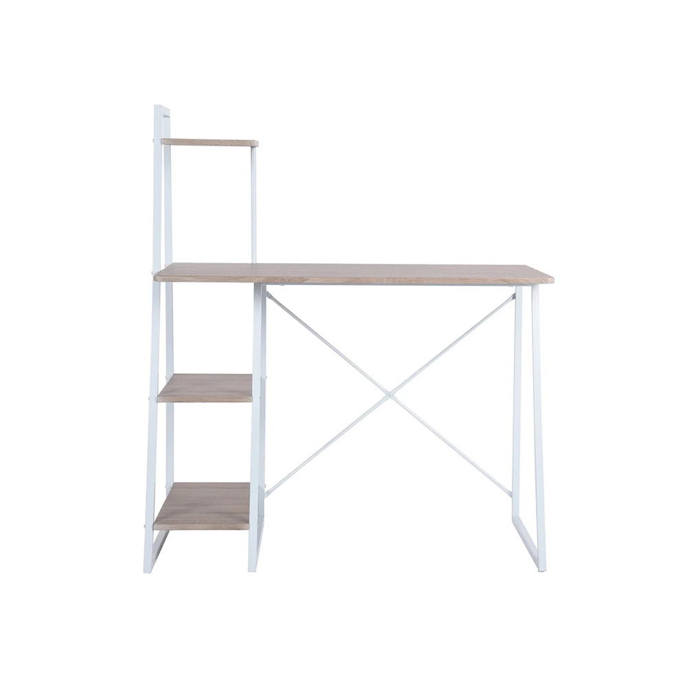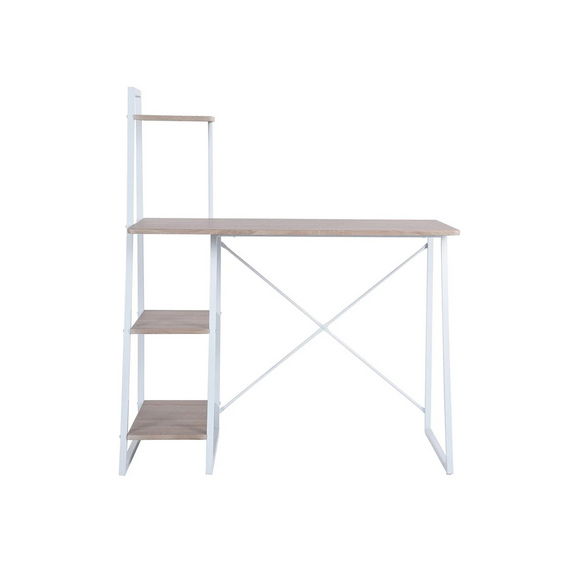 ელეგანტური კომპიუტერული მაგიდა გამოირჩევა თეთრი ლითონის ჩარჩოთი და თბილი ხის ტონის სამუშაო მაგიდით, ქმნის თანამედროვე და მიმზიდველ იერს. მაგიდას აქვს ჩაშენებული მრავალი თარო, რაც უზრუნველყოფს უამრავ საცავ სივრცეს წიგნების, დოკუმენტებისა და სხვა საოფისე ნივთებისთვის.