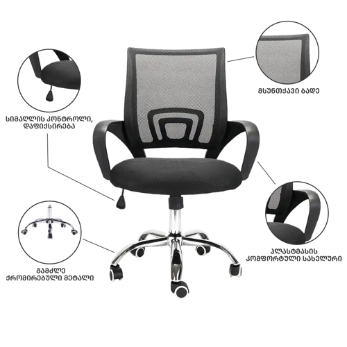 გაუმჯობესეთ თქვენი სამუშაო სივრცე მაქსიმალური კომფორტით და ელეგანტურობით ჩვენი ერგონომიული მაღალი ხარისხის საოფისე სკამით. სკამი დამზადებულია უმაღლესი ხარისხის მასალებისგან და უზრუნველყოფს თქვენს კომფორტულ და სწორ პოზიციაში მუშაობას, რაც დაგეხმარებათ მთელი დღის განმავლობაში რომ არ დაგეღალოთ კისერი და ზურგი.