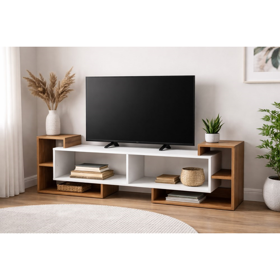 კონსტრუქცია დამზადებულია მაღალი ხარისხის მდფ (MDF) მასალისგან, რაც უზრუნველყოფს გამძლეობას, სტაბილურობასა და ხანგრძლივ ექსპლუატაციას. მრავალფუნქციური თაროები საშუალებას გაძლევთ კომფორტულად განათავსოთ ტელევიზორი, დეკორატიული ნივთები, წიგნები, დეკოდერები ან სხვა აქსესუარები, ხოლო კომპაქტური ზომები სივრცის ეფექტურ გამოყენებას უზრუნველყოფს.