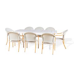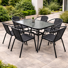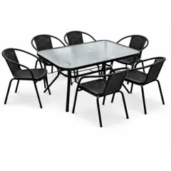 წრთობი მინის მაგიდისა და მოწნული იმიტაციის,პლასტმასის სკამების კომპლექტი მეტალის კარკასით თქვენს ინტერიერსა თუ ექსტერიერს შესძენს მყუდროებას და გამორჩეულ დიზაინს. ნაკრებში შედის 1 მაგიდა ქოლგის სამაგრით ზომით : 150*90*70 6 ცალი სკამი ზომით: 54*61*73 გამძლეობა: 120კგ