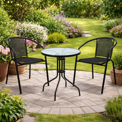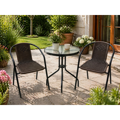 ნაწრთობი მინის მაგიდისა და მოწნული იმიტაციის,პლასტმასის სკამების კომპლექტი მეტალის კარკასით თქვენს ინტერიერსა თუ ექსტერიერს შესძენს მყუდროებას და გამორჩეულ დიზაინს. ნაკრებში შედის 1 მაგიდა ზომით : 60*70 2 ცალი სკამი ზომით: 54*61*73 გამძლეობა: 120კგ