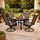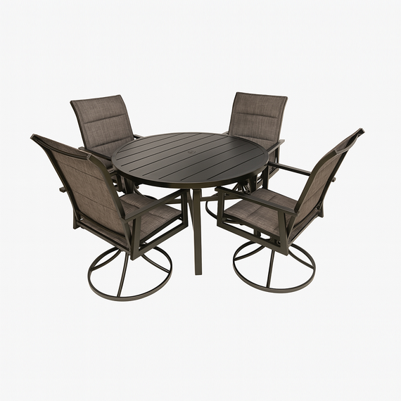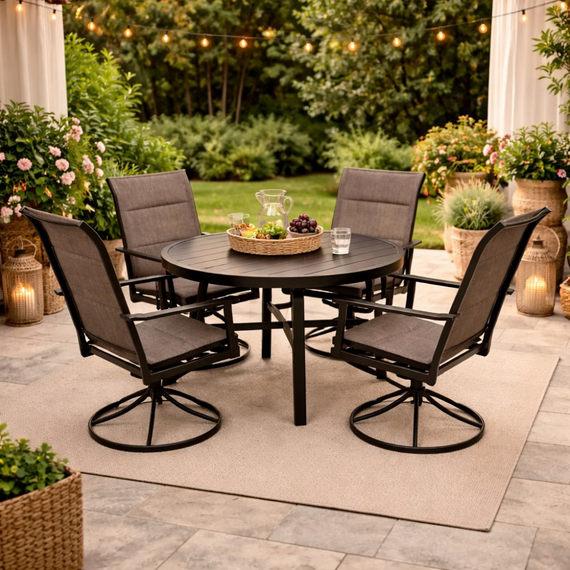 ბაღის ავეჯის კომპლექტი იდეალურია აგარაკისთვის, ტერასისთვის, კაფესთვის, სამზარეულოსთვის ან სახლისთვის. ელეგანტური დიზაინი შავ ფერში მარტივად ერწყმის ნებისმიერ ლანდშაფტს და ინტერიერს, ქმნის სიმყუდროვის და კომფორტის ატმოსფეროს. კომპლექტში შემავალი ოთხი 360°-ით მბრუნავი სკამი საშუალებას გაძლევთ მარტივად შეცვალოთ პოზიცია და დატკბეთ გარემოთი ნებისმიერი კუთხიდან.