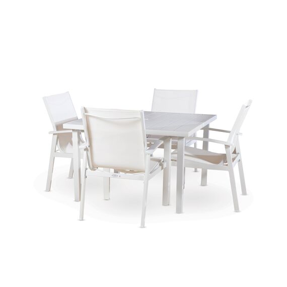 ალუმინის მაგიდა თეთრი (112-112*0.72სმ) და ოთხი სკამი ბადით(69*72*H89 სმ) BH-033